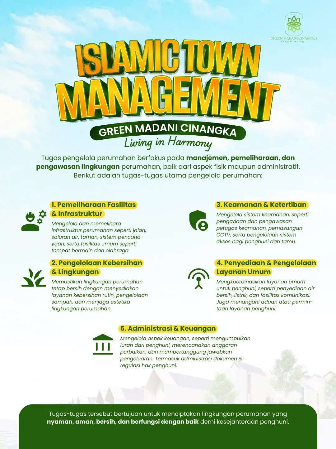 Green madani cinangka dikembangkan diatas lahan seluas 1.19 Hektar dan rencananya akan disediakan 110 unit rumah, khusus untuk keluarga muslim. perumahan ini insyaa Allah akan disediakan beberapa fasilitas penunjang umat muslim seperti masjid, Sekolah Sunnah, dan Area Olahraga
